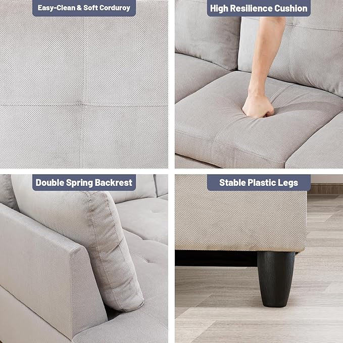 L-Shape 3-Piece Cloud Sofa, Couch for Living Room, Grey White Corduroy Fabric L-Shape with Reversible Chaise & Storage Ottoman, Ergonomic 110–115° Recline, Solid-Wood Frame