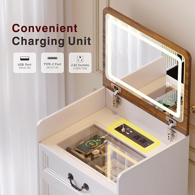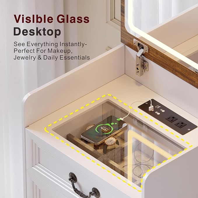 - 【All-in-One Charging Station】This makeup vanity desk includes 2 Outlets + 1 USB-A + 1 USB-C port. Never pause routines—plug in phones or earbuds directly. No more low-battery interruptions during makeup or work