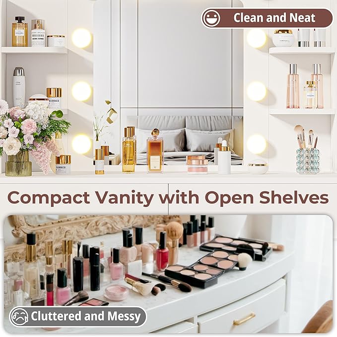 - Large Storage Space: This vanity desk measures 15.7" D x 35.4" W x 54" H - featuring 4 open shelves, 2 large drawers, 2 side shelves, and 1 bottom shelf. The 10-LED lighted vanity mirror provides perfect lighting while keeping makeup, perfume, and brushes neatly organized. Perfect for everyday makeup essentials and jewelry