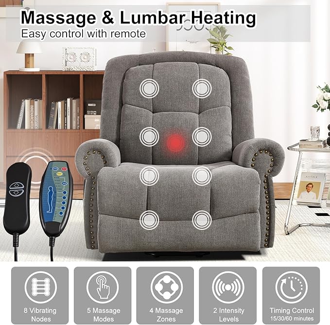 - Massage & Heat: This electric lift massage chair features 4 targeted massage zones (back, lumbar, thighs, and legs) with 5 distinct massage modes. Each region can operate independently with customizable 15/30/60-minute timers.