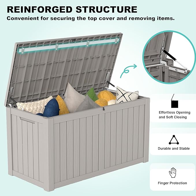 - WATERPROOF AND FADE RESISTANT: Made from premium waterproof and UV-resistant resin, this outdoor storage box is designed to withstand various weather conditions. Its sturdy construction ensures your items stay dry and protected, no matter the season.