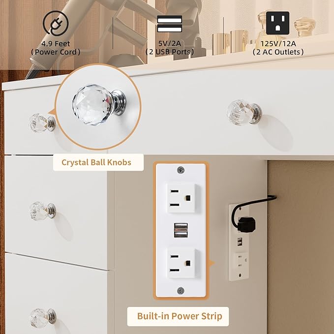 - Convenient Charging Station: Equipped with 2 standard plug sockets and 2 USB ports, this makeup desk allows for easy charging of hair dryers, curling irons, beauty devices, and phones.