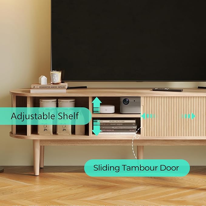 - Functional Entertainment Center – Designed with four separate storage compartments, this fluted TV stand offers versatile organization for everything from media players and board games to seasonal décor. The spacious open middle adjustable shelf is perfect for housing your media devices, gaming consoles, DVDs, While sliding doors cabinet provide easy access to keep your essentials neatly tucked away and your space clutter-free