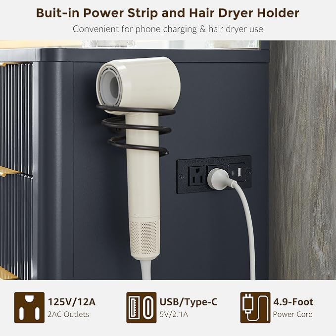 - Sophisticated and Sleek Glass Top & Charging Station: Designed for both style and function, the vanity features a transparent glass tabletop that offers a clear view of your beauty essentials stored below—for quick access and a clean, organized look. While the built-in charging station keeps your phone, tablet, or beauty devices powered as you get ready.Convenient hair dryer holder-Keeps your hair dryer close at hand and your countertop neat.