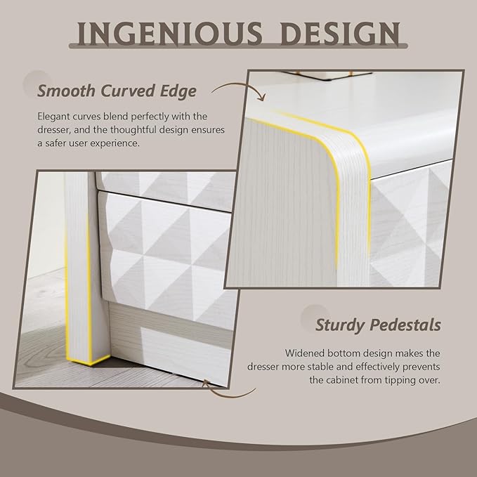 - GEOMETRIC DIAMOND-EMBOSSED DRESSER: Redefining functional elegance through clean geometry, this design pairs diamond-faceted drawers with wood panels joined at precise 45-degree angles, creating striking light-play that elevates visual drama. The modern luxury aesthetic is accentuated by signature metal handles - blending sculptural beauty with everyday practicality