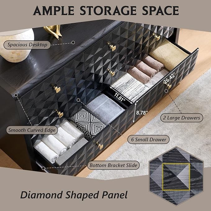 Modern 8 Drawer Dresser for Bedroom, Wooden Large Dressers &Chests of Drawers w/Two Different Drawer Sizes, Mid Century Modern Dresser w/Diamond Panel Decorate for Bedroom, Curved Profile Design,Black