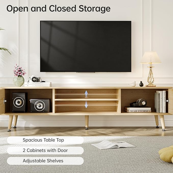 - 【Versatile Storage Solution】 This wooden TV stand serves not only as a support for your TV but also as a practical storage solution. The tv stands for living room is suitable for TVs up to 70 inches. The spacious tabletop can not only stably hold your TV but also display vases, photos, and other decorations. Additionally, the ample internal storage space effortlessly accommodates media accessories, ensuring a stylish and organized entertainment area.