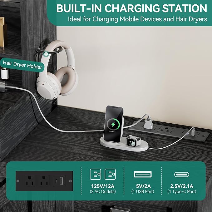 - Charging Hub at Your Fingertips: Power your vanity workstation with ease. The built-in power hub offers 2 AC outlets, 1 USB, and 1 type-C port, great for charging while you get ready. Easy setup with step-by-step instructions