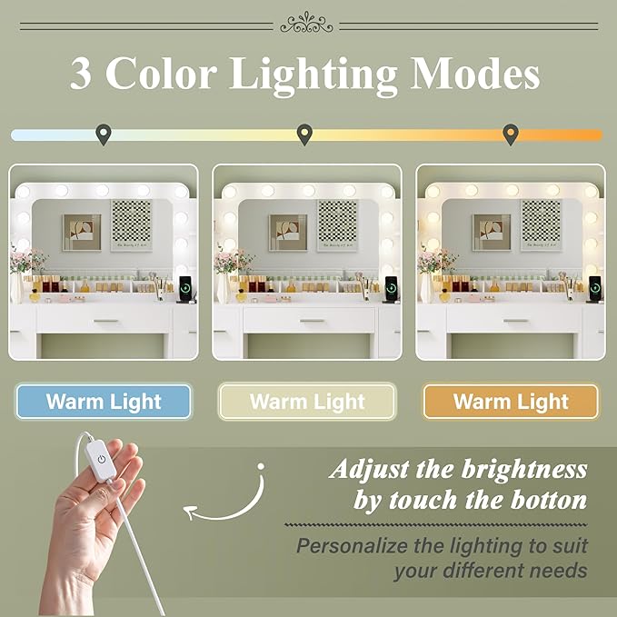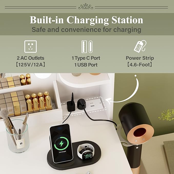 - Convenient Accessories:The right side of the desktop has a built-in charging station for curling irons, hair dryers, beauty tools, and phone charging. The desktop charging station is within easy reach, eliminating the need to bend over and improving usability. Additionally, a hair dryer stand is included, allowing you to style your hair in front of the mirror. These convenient accessories make your beauty routine more efficient and enjoyable.