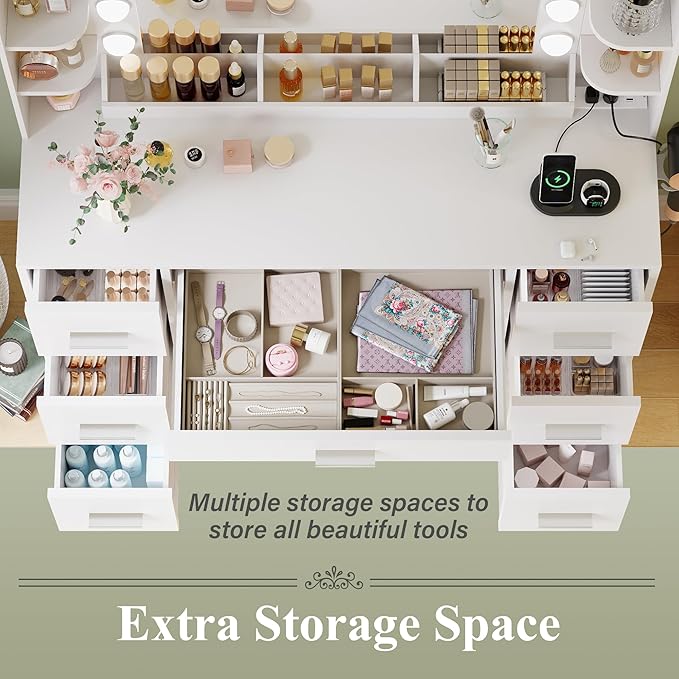 - Well-designed Storage Space:The vanity features a large drawer in the center for storing and displaying jewelry and other items. The sides include six deep drawers for storing various bottled skincare products. The desktop features six open shelves and three extra-wide storage compartments, providing ample space for frequently used beauty essentials, allowing you to effortlessly find what you need.