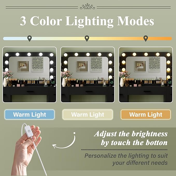 - Hollywood-style Illuminated Mirror:The mirror measures 26.5 inches in width and 17.3 inches in height. The spacious mirror is suitbale for beauty care and hairdressing. With three lighting modes, you can choose the perfect lighting to create a flawless makeup look and enjoy a beautiful lifestyle instantly.