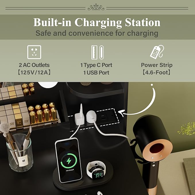 - Convenient Accessories:The right side of the desktop has a built-in charging station for curling irons, hair dryers, beauty tools, and phone charging. The desktop charging station is within easy reach, eliminating the need to bend over and improving usability. Additionally, a hair dryer stand is included, allowing you to style your hair in front of the mirror. These convenient accessories make your beauty routine more efficient and enjoyable.