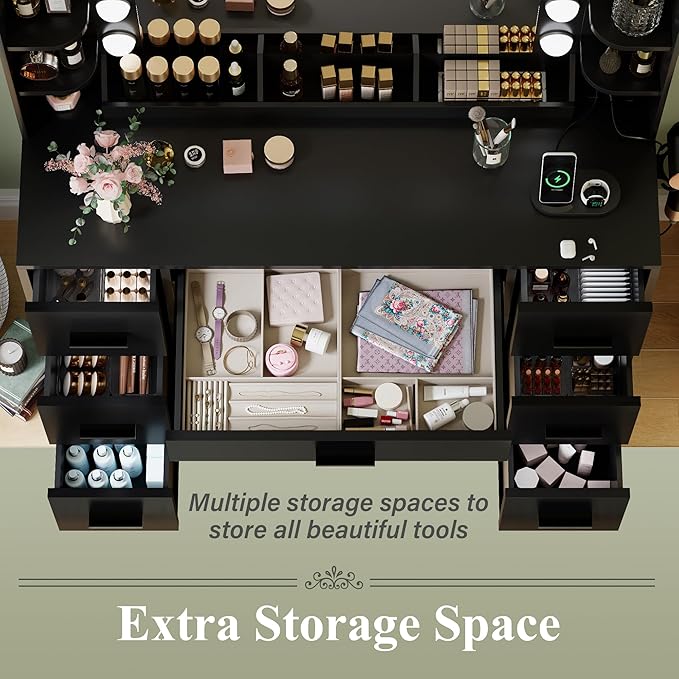JUMMICO Makeup Vanity Desk with Large Mirror and Lights, Vanity with Power Strip and Hairdryer Holder, 6 Open Shelves and 7 Drawers Modern Dressing Table, for Bedroom (Black)