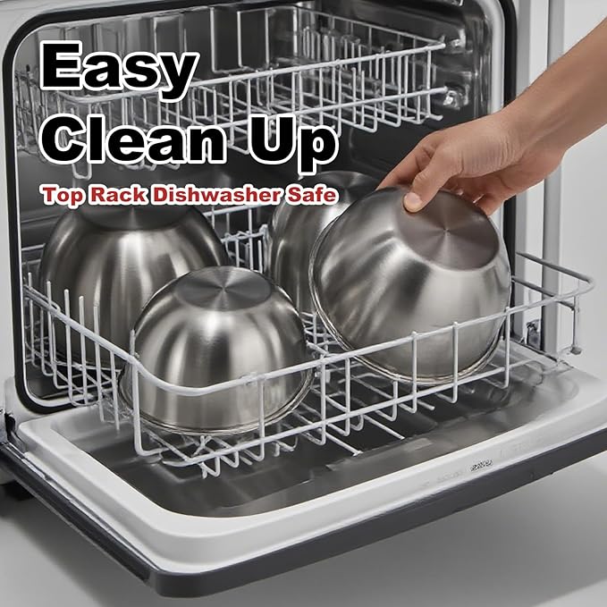 - [PREMIUM 304 STAINLESS STEEL: TOUGH & HYGIENIC] ,Mixing bowl set made of food-safe 304 stainless steel with a smooth, non-porous interior that resists stains, odors. Dishwasher safe for hassle-free cleanup – no more scrubbing stuck-on dough