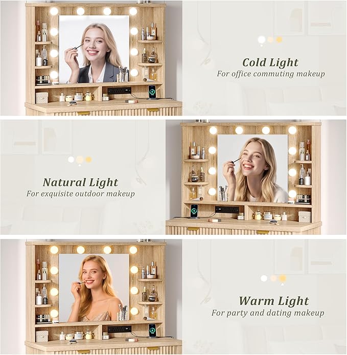 - 【3-Color Adjustable Lighting】The mirror on the makeup vanity features three color temperature modes—cool light, natural light, and warm light—corresponding to different scenarios in your daily life such as office work, outdoor activities, and social gatherings. The high-definition mirror ensures a clear and accurate reflection, combined with adjustable brightness to eliminate any factors that could compromise makeup precision. This allows you to achieve a flawless look in any setting. Completely suitable for both home use and professional makeup studios.