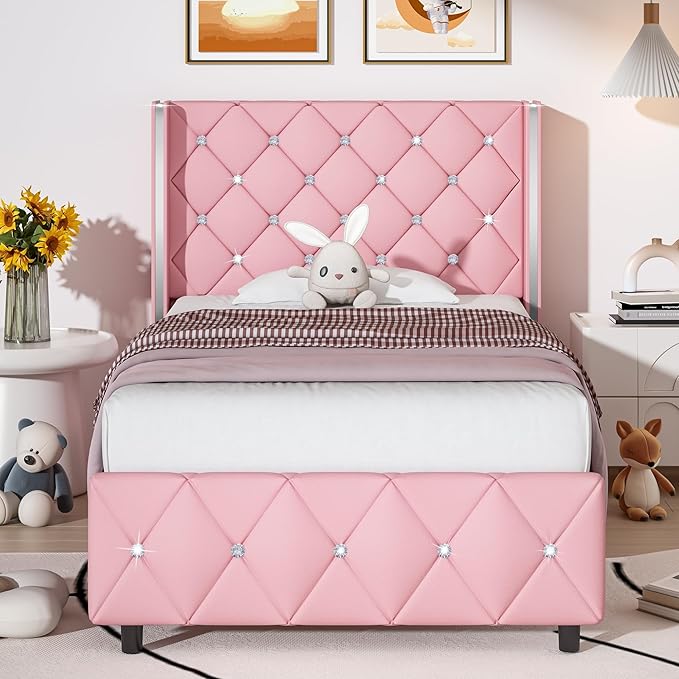 Twin Bed Frame with Headboard, Faux Leather Upholstered Bed with Diamond Tufted Design, Girls' Twin Bed Frames for Kids, No Box Spring Required, Easy Assembly, Pink
