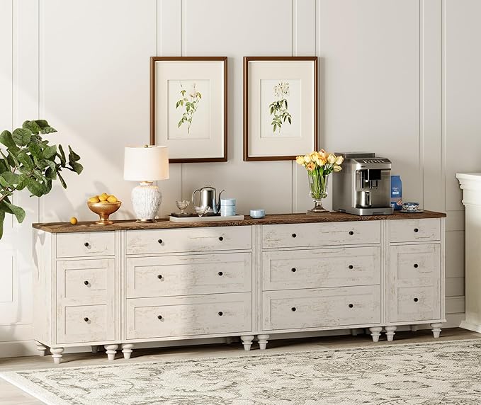 - 【4-in-1 Multipurpose TV Cabinet】The 4-in-1 large vintage white tv stand can be used separately as two cabinets or dressers. In addition to entertainment center, it can be placed in the dining room as a kitchen buffet cabinet or in the entryway as a console table. Overall Dimension: 100.8"×15.7"×30.9" They are sent separately in 3 packages, so you may receive them at different times.