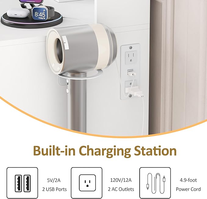 - 【BUILT-IN POWER OUTLET】Vanity desk with mirror and lights features the built-in power outlet with 2 outlets and 2 USB ports, you can use eazily of curling irons, hair dryers, and phone charging. Unique hair dryer rack is more convenient for you to use, you sit at your makeup desk and use the hair dryer within arm reach, creating exquisite makeup and hairstyle designs.