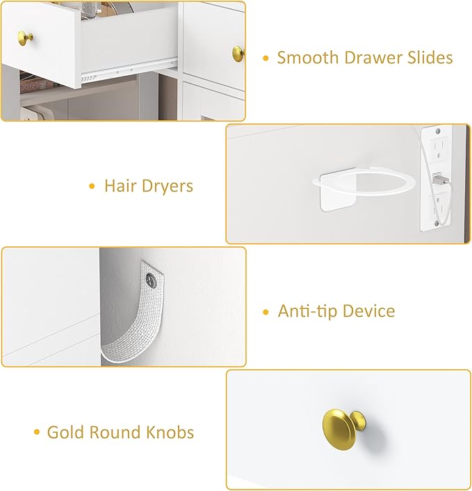 - 【EXCELLENT MAKEUP VANITY】Hollywood design enhances the vanity desk with a sense of depth and style than others. No longer need to worry about finding the suitable gifts, the vanity mirror with lights desk combines function and beauty, it's not only designed anti-tipping device to protect your family, but also ideal item for your girlfriend, wife, mom or daughter on special days.