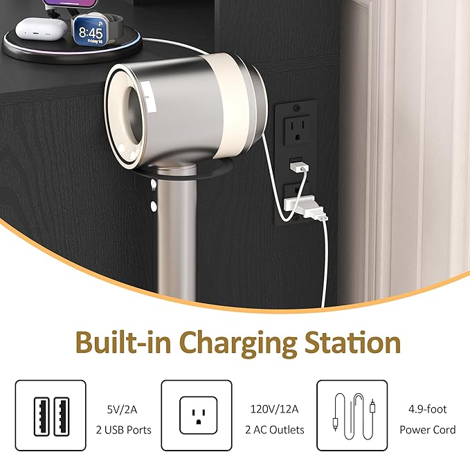 - 【BUILT-IN POWER OUTLET】Vanity desk with mirror and lights features the built-in power outlet with 2 outlets and 2 USB ports, you can use eazily of curling irons, hair dryers, and phone charging. Unique hair dryer rack is more convenient for you to use, you sit at your makeup desk and use the hair dryer within arm reach, creating exquisite makeup and hairstyle designs.