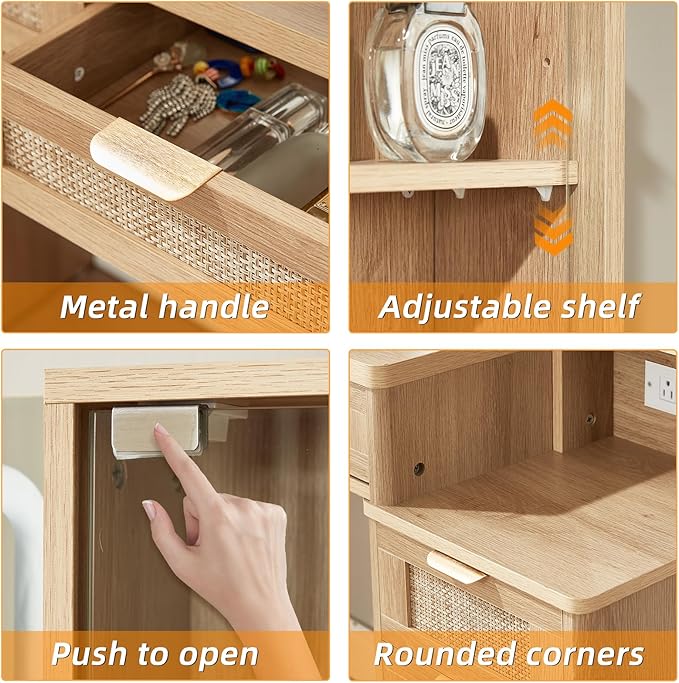 - Ample Storage Space : Our rattan makeup vanity dresser with features a storage shelf with a glass door, keeping makeup brushes and powder puff free from dust. The adjustable shelf design accommodates items of various heights, from short nail polish bottles to tall lotions. The boho vanity also includes 4 vertical drawers, making access and storage more convenient. This vanity offers plenty of storage space to meet the needs of every beautiful girl for organizing makeup and styling essentials.