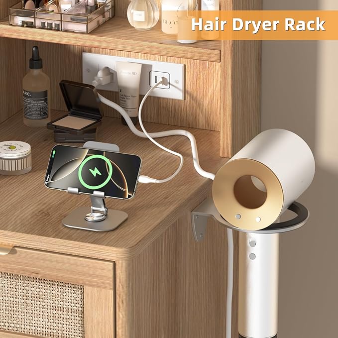- Rattan Vanity Desk with Stool, Mirror, Lighting, Charger : This makeup vanity features exquisite rattan craftsmanship, perfect for creating a natural and cozy atmosphere.With a large mirror and adjustable lighting and the matching chair, this rattan vanity looks flawless from every angle. The built-in charger allows every woman to style herself while watching her favorite shows. The light from the illuminates the glass tabletop, making your watches and jewelry in the drawers sparkle brilliantly.
