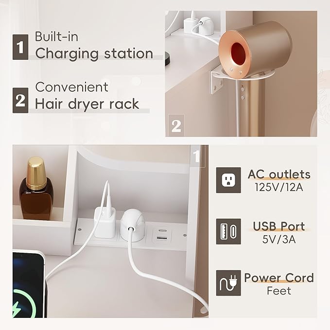 - Power Outlet: The vanity table is equipped with two sockets, one USB port and one TYPE-C port. It provides great convenience for charging your mobile phone or other electronic devices.