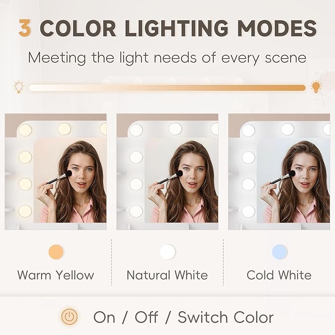 - 11 Adjustable Lights: A large mirror is designed on the dressing table. There are eleven lamps around the mirror. You can adjust the color of the lights through the remote control. There are three lighting modes for you to switch between.