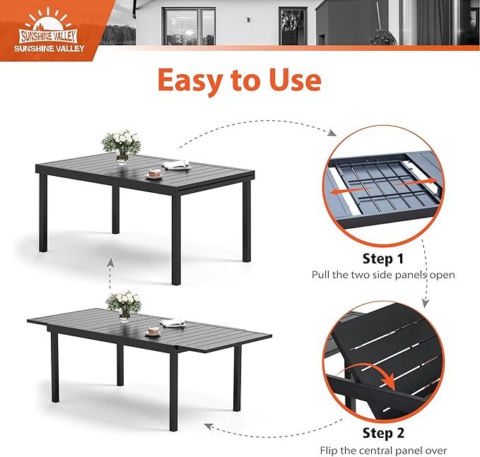 - EXPANDABLE SLATTED PATIO TABLE: This classic slatted tabletop design, with safe slat spacing, Not only is it easy to remove water and food debris, but also keeps your fingers safe. The expandable tabletop can be extended for 8 people when needed, which helps you save outdoor space.