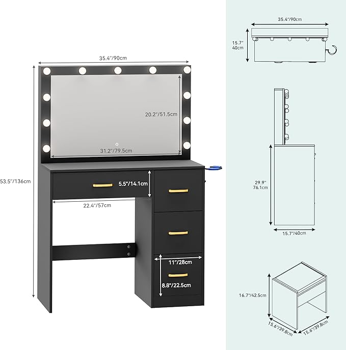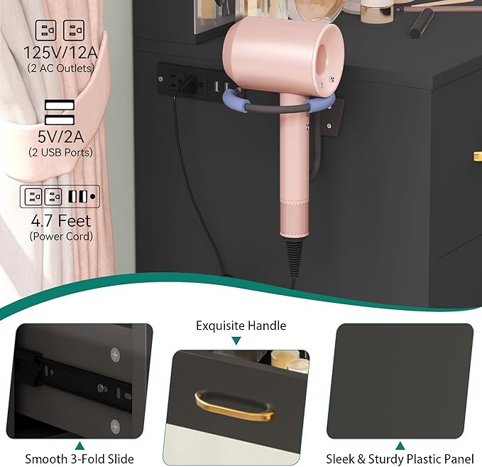 - Power and Convenience in One Table: Stay connected while you get ready; The makeup vanity features 2 AC outlets, 1 USB port, and 1 Type-C port, plus a built-in hair dryer rack to keep your tools within easy reach