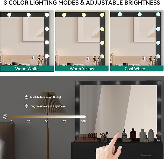 - Star-Inspired Glam for Your Daily Routine: Enjoy a large vanity mirror framed with 11 LED bulbs; Select warm, neutral, or cool light at a touch, and adjust brightness with a press so your vanity desk always matches your makeup needs