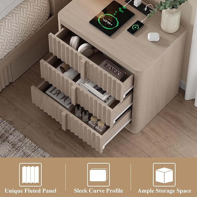Fluted Nightstand Set of 2 with Charging Station, 23.6" Wood End Table with Solid Wood Handle, Mid Century Moden Bedside Table 3 Drawer Dresser for Bedroom, Living Room, Natural Oak