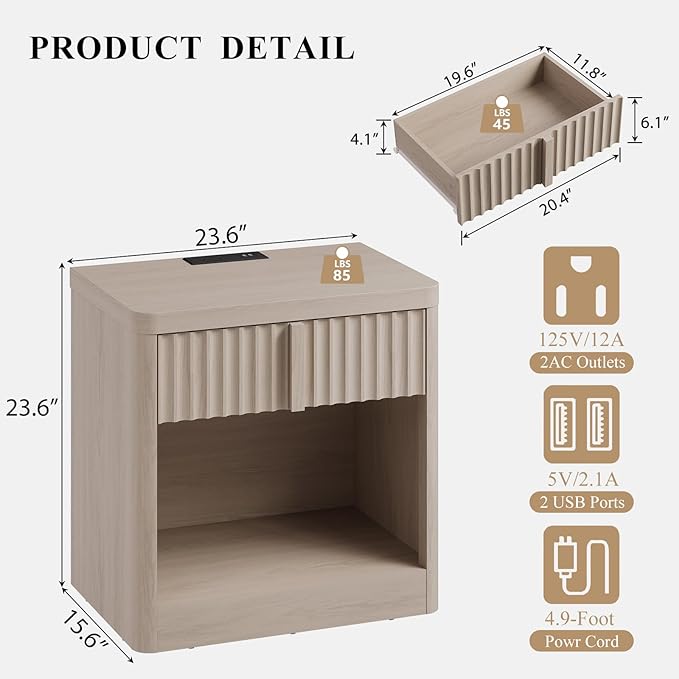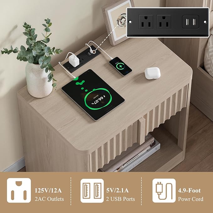 - 【Nightstand with Charging Station】This nightstand with charging station features 2 USB ports and 2 AC outlets for effortless charging. The bedside table with USB ports keeps phones and tablets within reach while reducing cable mess. A rear cable hole neatly hides wires, making your small nightstand look clean, modern, and well-organized every day