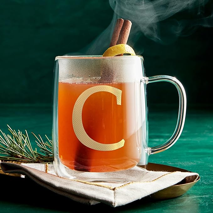 COLLECTIVE HOME - Double Walled Glass Coffee Mugs, Insulated Coffee Mug with Handle, Personalized Gifts for Women, Men, Christmas, 14 oz Monogram Cups (C)