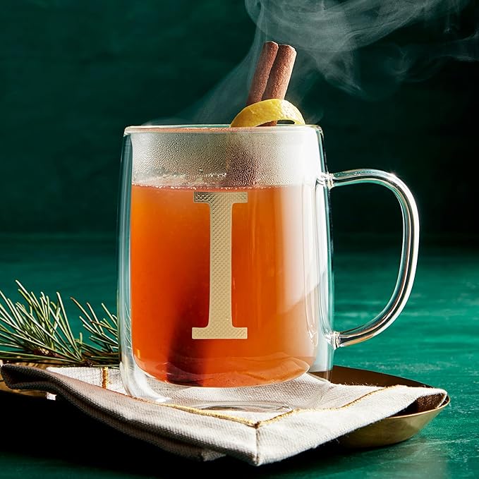 COLLECTIVE HOME - Double Walled Glass Coffee Mugs, Insulated Coffee Mug with Handle, Personalized Gifts for Women, Men, Christmas, 14 oz Monogram Cups (I)