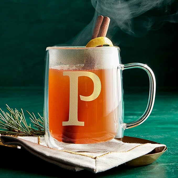 COLLECTIVE HOME - Double Walled Glass Coffee Mugs, Insulated Coffee Mug with Handle, Personalized Gifts for Women, Men, Christmas, 14 oz Monogram Cups (P)