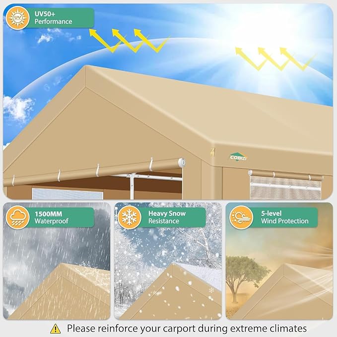 COBIZI Carport 10x20ft Heavy Duty Portable Garage, 2.0 Powder Coated Frame(Better Than Galvanized), Waterproof Shelter with Removable Sidewalls & Windows, Built-in Sandbags, for Car/Boat/SUV, Khaki