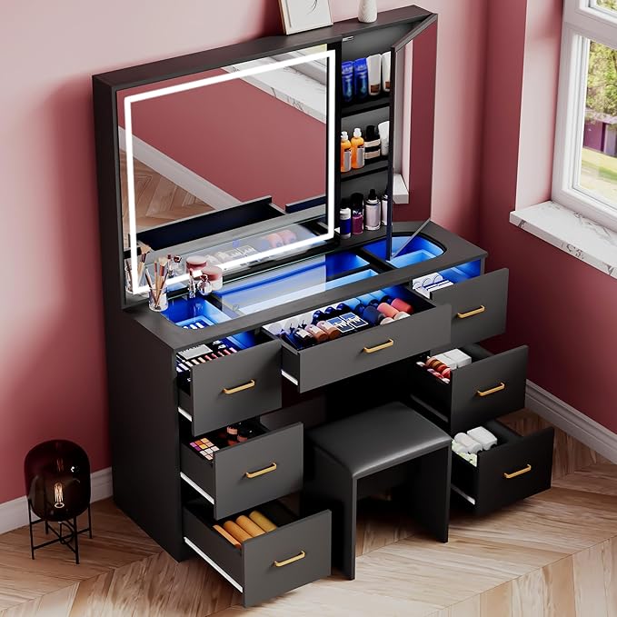 Vanity Desk with Mirror and Lights,Makeup Vanity Table with Glass Top and 7 Drawers&Cushioned Stool,Dressing Table with Drawers, Bedroom Makeup Desk for Women(Black-Glass top)