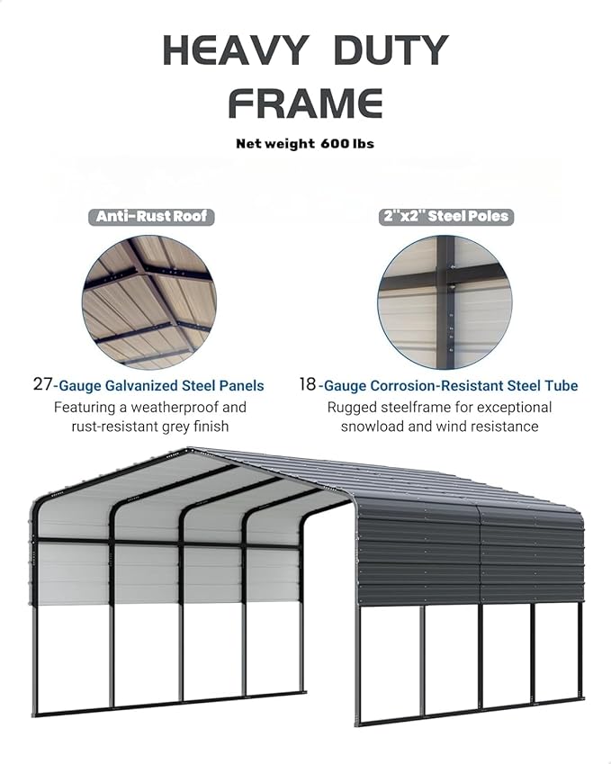 - Reliable Sturdy Frame: Unlike traditional canvas carports, this upgraded metal carport boasts a robust galvanized steel roof and a powder-coated steel frame. Rigorously tested over 1,000 times, it offers a 35% improvement in both installation ease and stability compared to other options on the market. This reliable frame structure ensures that your carport can withstand the rigors of outdoor use while providing peace of mind for vehicle protection.