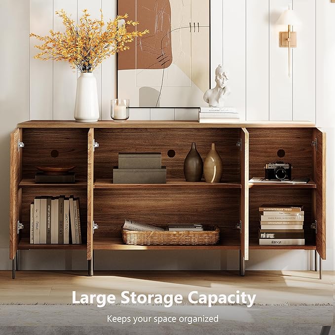 WAMPAT 61.6" TV Stand Cabinets for TVs up to 75 Inches, Entertainment Center with Storage Cabinets and 4 Doors, Mid Century Modern Media TV Console Table for Living Room Bedroom, Brown