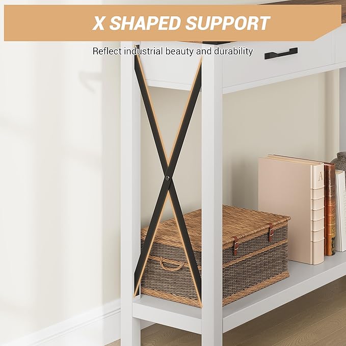 - Sturdy Console Table: The sturdy MDF board and X-frame construction provide lasting stability for years of use. Each shelf can bear up to 50 lbs, the drawer can take up 22 lbs, and the tabletop can bear up to 150 lbs.