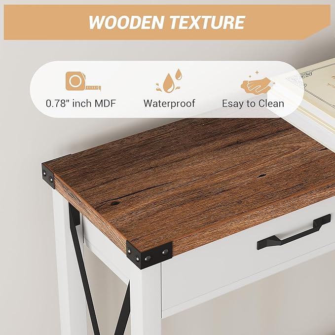Klaesio 31-inch Side Table Suitable for Entrances, Hallways, and Living Rooms Two-Tier Narrow Sofa Side Table Industrial-Style Entrance Table with Drawers and Open Storage Shelves - White + Brown