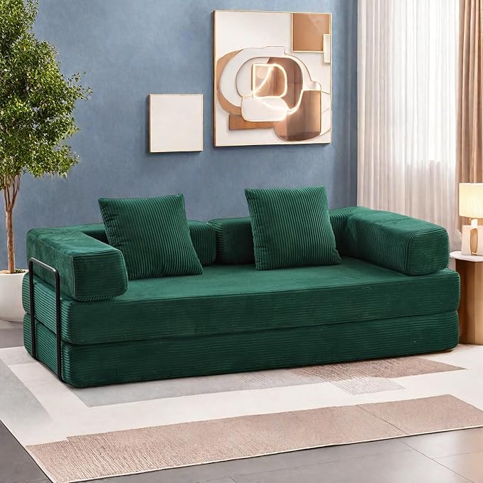 Convertible Sofa Bed, Compression Futon Sofa with Pillows & Armrest, Foldable Mattress Couch with Fixed-Shape Frame, Comfy Couch Lounge Sleeper Bed for Living Room Bedroom, Green