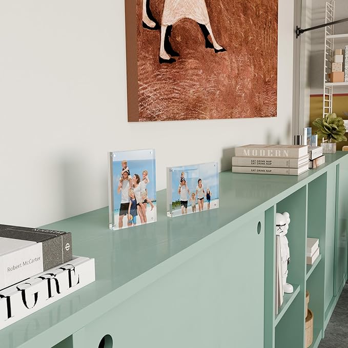 - Double-Sided Magnetic Display - Display two photos back-to-back effortlessly with ultra-strong corner magnets. The 20% thicker acrylic panels ensure stable free-standing orientation (horizontal/vertical) while allowing quick photo swaps