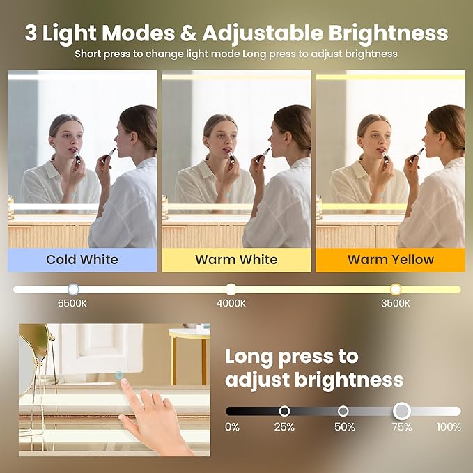 - Large Mirror and Customizable Lights: Featuring 31-inch full-sized mirror for clear, accurate reflection ensuring precision in your makeup application.The adjustable LED mirror provides three lighting modes—Cool (6500K), Warm (3500K), and Natural (4500K)—with touch controls to switch modes and adjust brightness. Ideal for different scenes as home, salons, and studio makeup applications