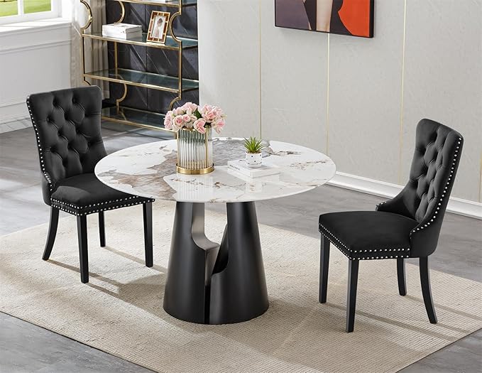 - Modern 3-Piece Round Faux Marble Dining Table Set for 2: This 3pcs dining room table set includes 1 faux Marble kitchen table and 2 upholstered velvet dinner chairs. With a minimalist look and luxury modern design, this beautiful large Faux Marble dinner table set will fit perfectly with a wide array of home decor