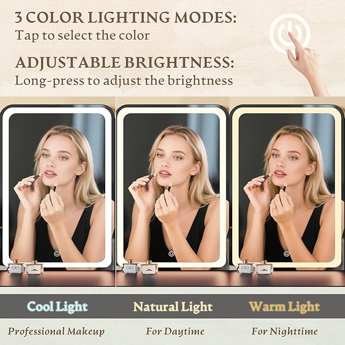 - [3 Lighting Modes & Adjustable Brightness]: The makeup table is equipped with an LED lighted mirror featuring adjustable brightness and 3 light modes (warm, natural, and cool), which fully meets your makeup needs during daytime, nighttime, daily use, and professional application.