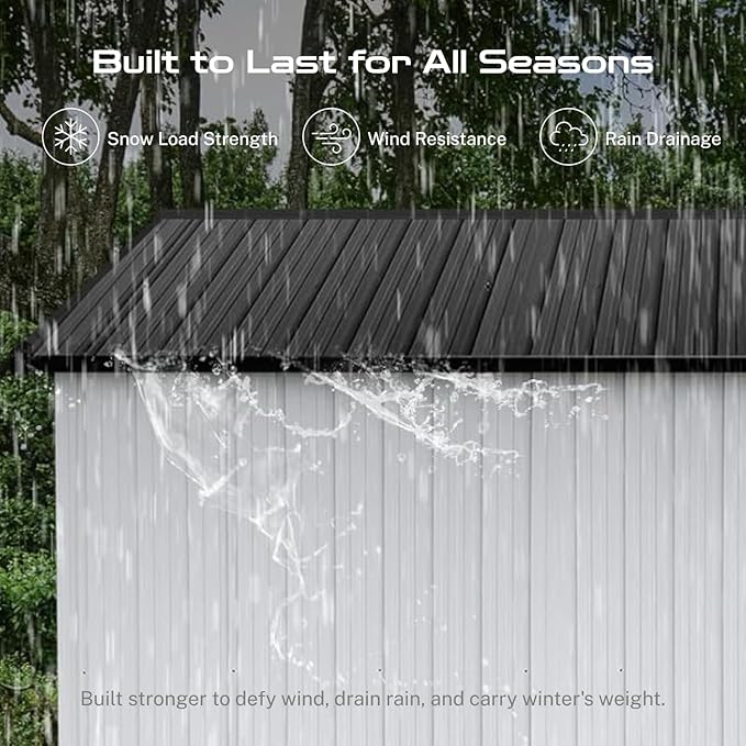 - ☔ [Sloped Roof for Superior Weather Protection] Designed for real-world conditions, the efficient sloped roof system guarantees optimal rainwater drainage, preventing damaging pooling and leaks. This key feature in our storage buildings and sheds clearance design minimizes maintenance and ensures your tools, equipment, and belongings stay consistently dry inside