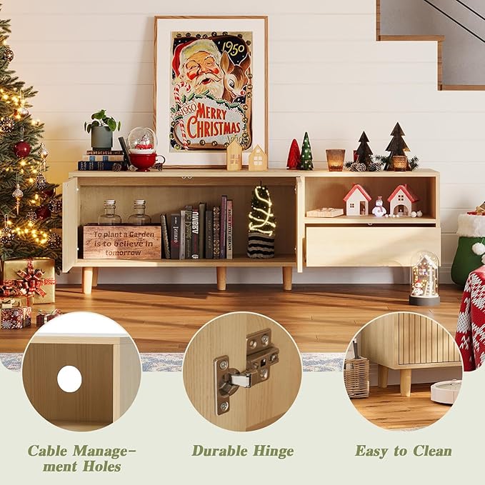 - Hidden Press Mechanism: This mid-century modern style TV cabinet reinvents classical flavor with minimalist aesthetics, and its doors and drawers are designed with hidden form presses, discarding traditional hardware pulls for a visually seamless transition