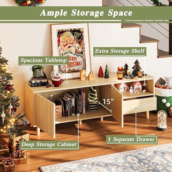 58" Mid Century Modern TV Stand for 32-65 inch TVs, Light Wood TV Console with with Fluted Doors and Drawer, Entertainment Center with Storage for Living Room, Oak